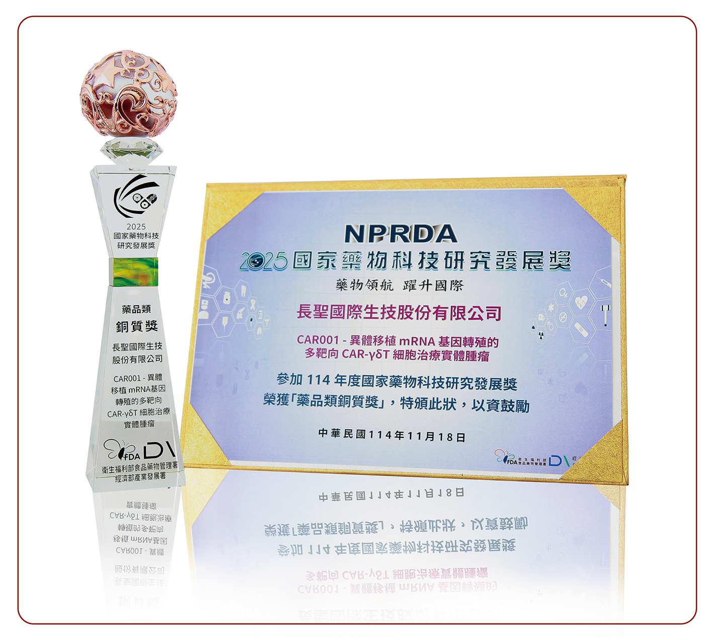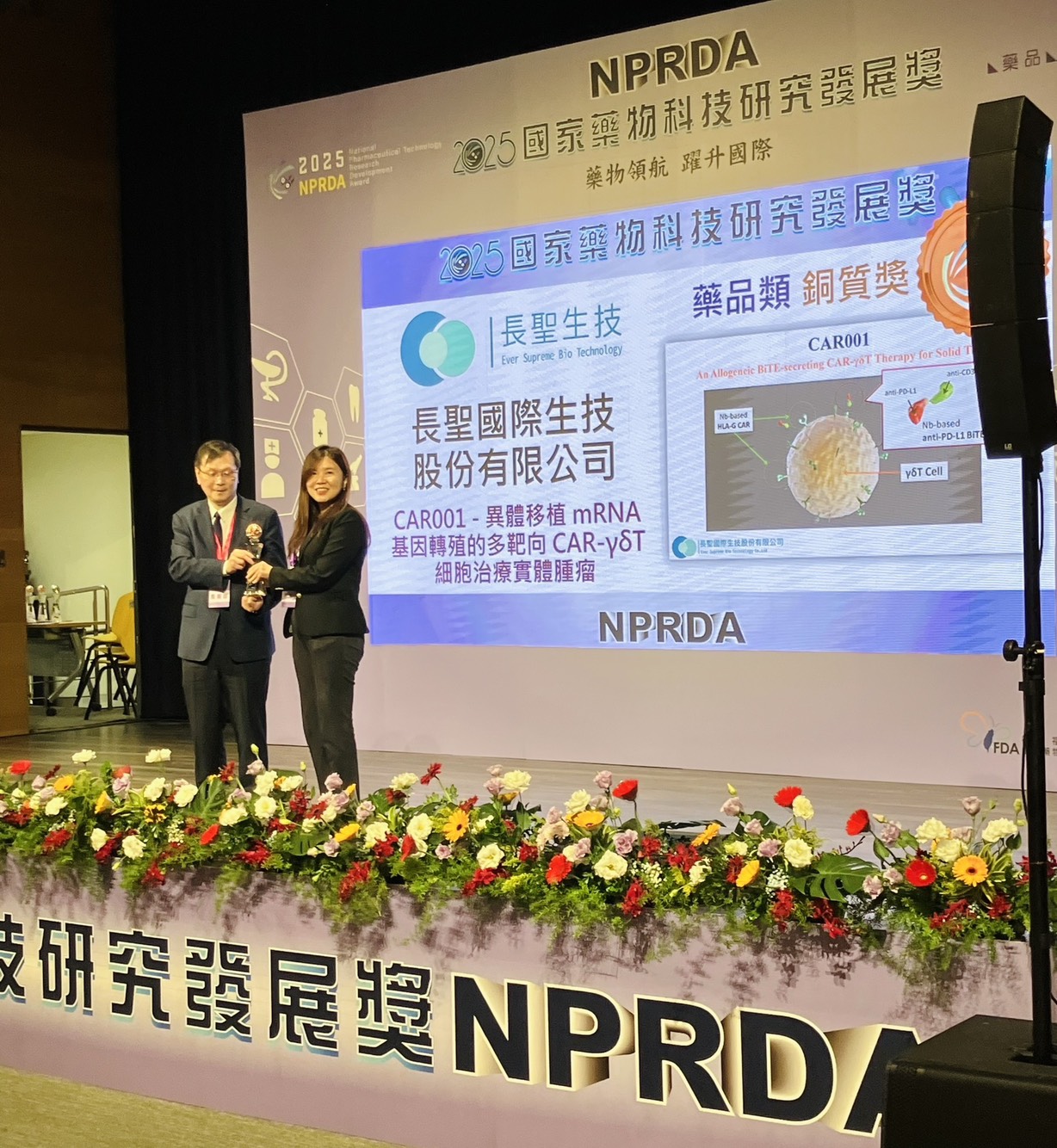 On November 18th, the Ministry of Health and Welfare and the Ministry of Economic Affairs jointly held the "2025 National Pharmaceutical Technology Research and Development Award" ceremony at the National Biotechnology Research Park. Ever-Supreme's "CAR001-Allogeneic mRNA Gene Transplantation Multi-Targeted CAR-γδ T Cell Therapy for Solid Tumors" won the Bronze Award in the Pharmaceutical Category. This multi-target immunotherapy, which targets allogeneic, non-viral mRNA editing, is specifically designed for refractory solid tumors such as colorectal cancer, triple-negative breast cancer, glioblastoma, and non-small cell lung cancer. Its outstanding achievements in the research and development field were recognized by the judges. It is hoped that with the continued support and promotion of various units, they can work together to create new value for biotechnology and pharmaceutical brands and steadily move towards the goal of bringing better health to the people of Taiwan.
