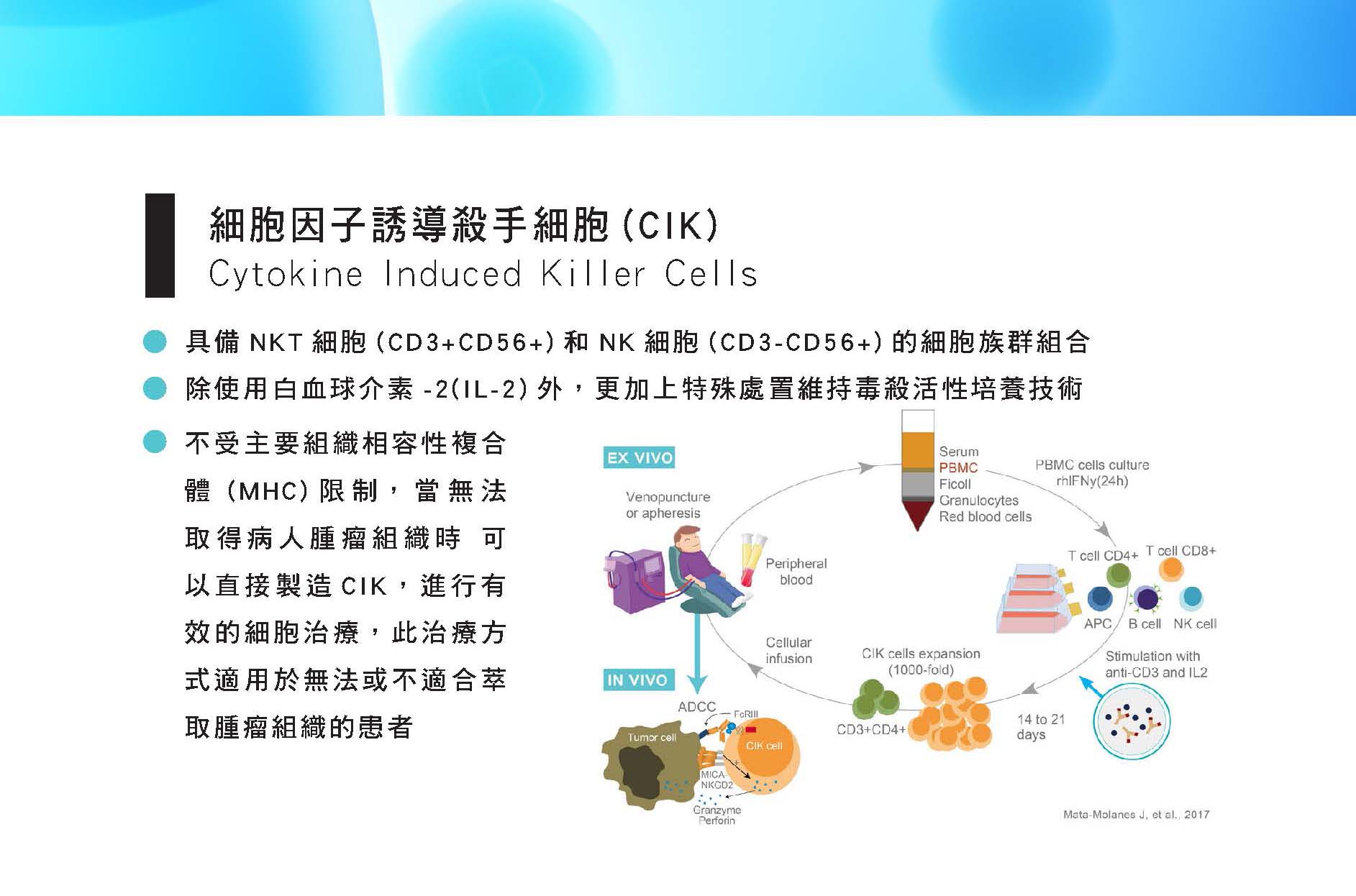 具備NKT細胞(CD3+CD56+)和NK細胞(CD3-CD56+)的細胞族群組合,除使用白血球介素-2(IL-2)外,更加上特殊處置維持毒殺活性培養技術,不受主要組織相容性複合體 (MHC)限制,當無法取得病人腫瘤組織時 可以直接製造CIK,進行有效的細胞治療,此治療方式適用於無法或不適合萃取腫瘤組織的患者。